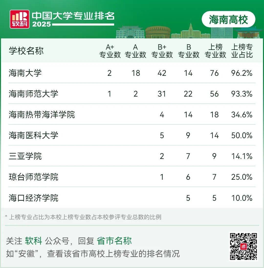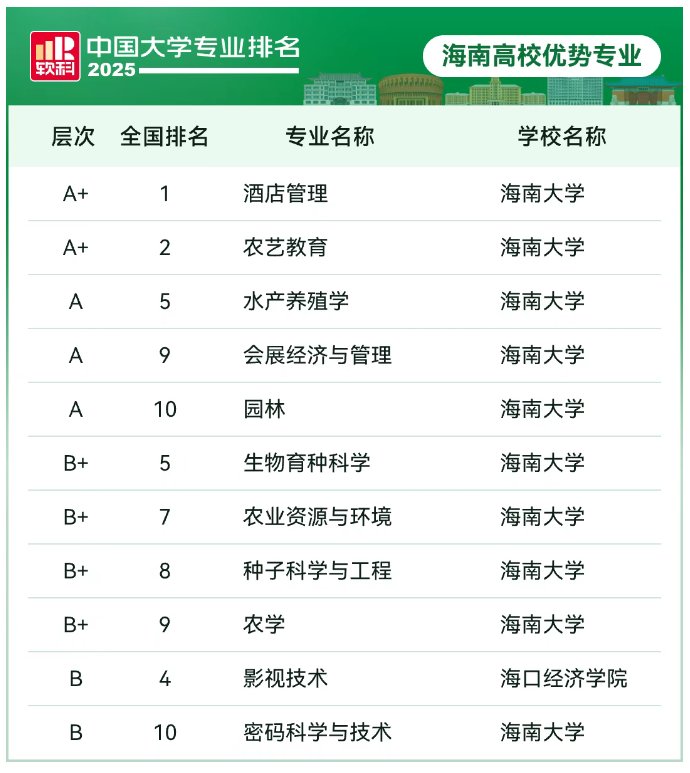 (椰网/海拔新闻记者 许文玉)6月18日,高等教育专业点评组织软科发布“”,包含836个专业,触及93个专业类、12个专业类别。其间,海南共有7所高校的185个专业上榜。 A+专业数3个,A专业数20个,B+专业数85个,B专业数77个。从上榜专业数量来看,海南大学以76个专业上榜专业数领跑全省。此外,海南师范大学上榜专业数56个、海南热带海洋学院上榜专业数18个、海南医科大学上榜专业数14个、三亚学院上榜专业数9个、琼台师范学院上榜专业数7个、海口经济学院上榜专业数5个。 从顶尖专业数量来看,海南共3所高校具有A+专业数。其间,海南大学有2个A+专业数,海南师范大学有1个A+专业数。 软科我国大学专业排名是迄今为止掩盖专业数量最多、参评专业尖端规划的我国大学本科专业排名。软科我国大学专业排名发布排名的对象是开设校园数量不少于4所的专业,合计639个,每个专业发布的是排名位列前50%的高校,共有1110所高校的30930个专业点上榜。 值得一提的是我省共有11个专业排名全国前10名,其间10个来自海南大学,分别是酒店办理专业(第1名)、农艺教育专业(第2名)、水产饲养学(第5名)、生物育种科学(第5名)、农业资源与环境(第7名)、种子科学与工程(第8名)、农学(第9名)、会议经济与办理专业(第9名)、园林(第10名)、暗码科学与技能(第10名)。这些优势专业凸显出了海南大学在农学和办理学范畴的学科优势。此外,海口经济学院的影视技能专业位列全国第4名。 近年来,我省加速展开产教交融特征专业群遴选建造作业,瞄准服务国家战略需求、服务海南四大主导工业高质量开展需求,加强产教交融型课程教育系统建造,共建校企实习实训渠道,树立校企人才双向交流机制,实在提升为工业培育急需人才的水平。
